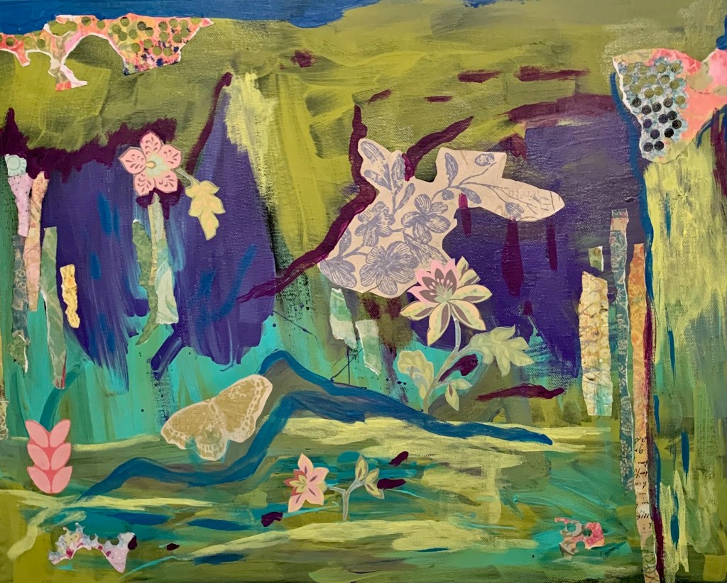 My latest pieces are multi-layered expressions of the interconnectivity of all things. In the studio I work quickly between multiple canvases, building organic scenes in a vivid color palette. The paint that left when a painting is complete provide the starting layer for the next painting.