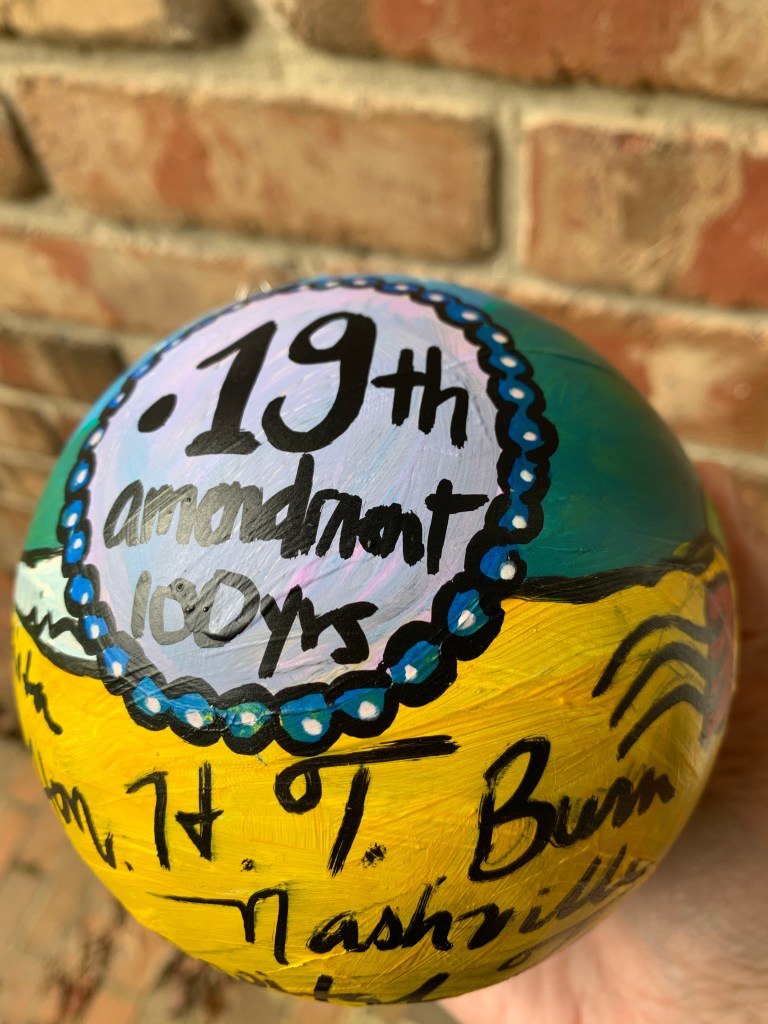 When I was asked to be the artist representing Mcminn County in the Tennessee County Ornament Project, I felt honored to design a holiday ornament. I did some research about McMinn County and came across the story “Tennessee Statesman Harry T. Burn: Women’s Suffrage, Free Elections and a Life of Service” by Tyler L. Boyd. I knew the story of the letter sent by Burn’s mother encouraging him to vote for women’s right to vote needed to be included on the ornament.
