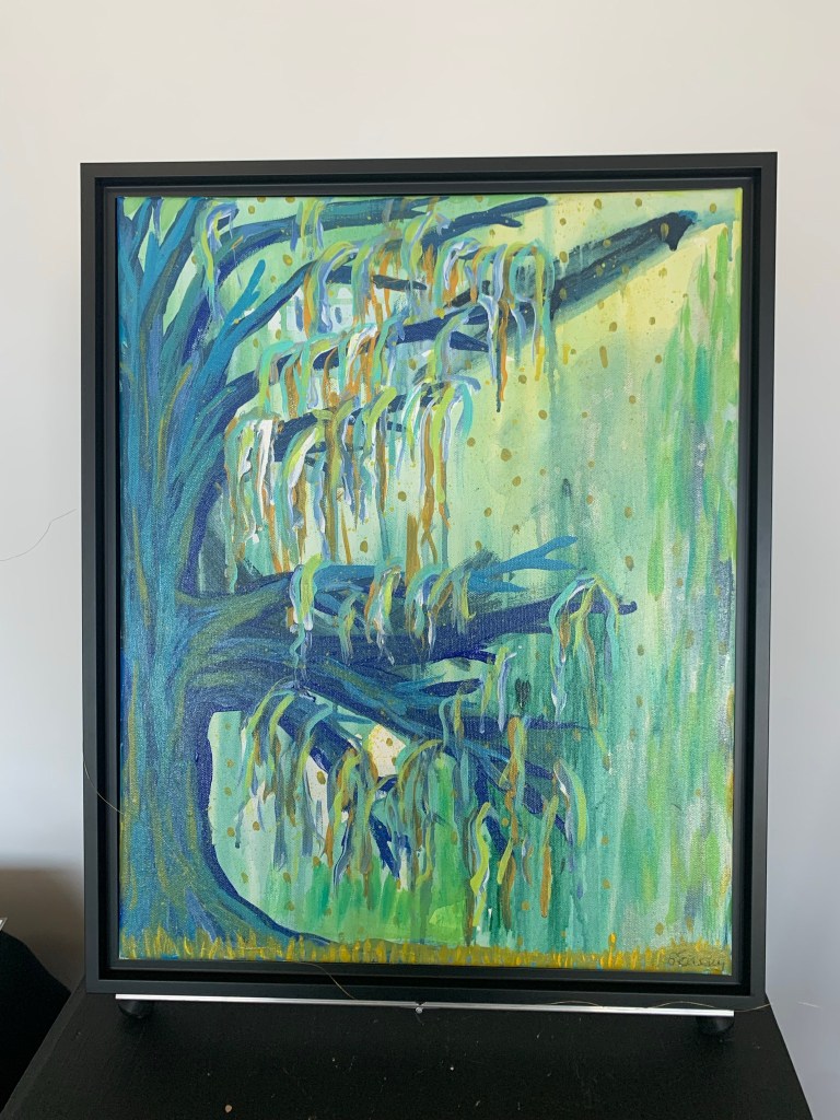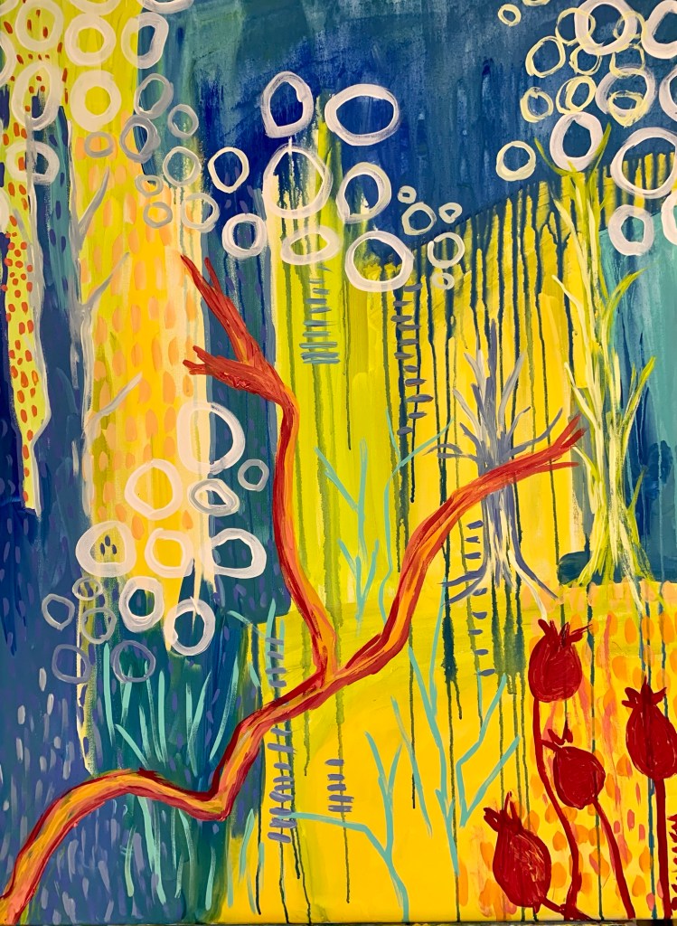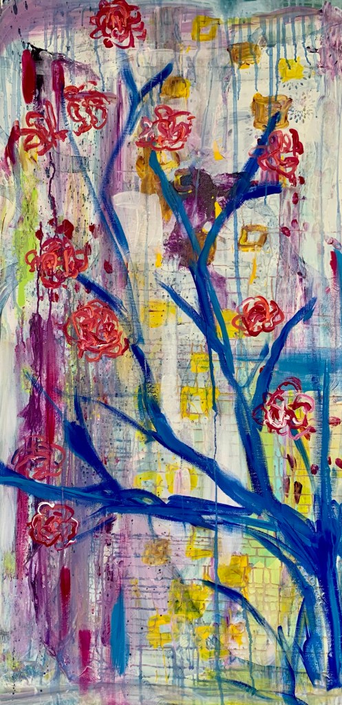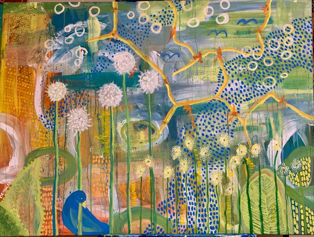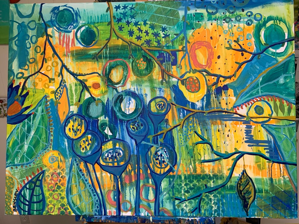 I wanted to depict a sense of adventure and space, as well as the passage of time. The drips of paints in the background, painted over multiple layers, help to add dimension and interest. A middle ground for the piece in the broad circles, impressionistic suns and bare branches encourage the viewer’s eyes to travel around the canvas. Furthermore, the broad vertical dabs and lines, and the lotus pods in the foreground add to the wildness of this painting.