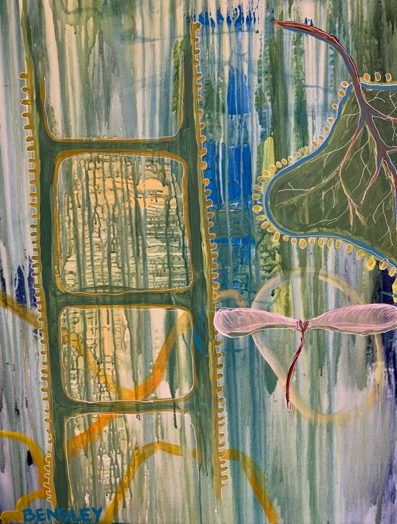 The “tree cell” in this painting was created by first allowing the paint to run horizontally, then vertically before adding the ridged details that mimic the edge of the leaf. The paint drips can also be found in the background of the piece.