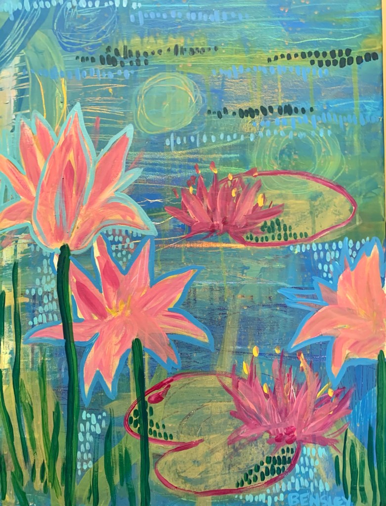 In this painting I have used multiple layers in various shades of blue and small circles to evoke the feeling of water. The patterned dabs of paint and circles scratched into the surface of the canvas are reminiscent of water drops. I have then painted a whimsical foreground of waterlilies in jeweled tones of pink to add warmth and depth.