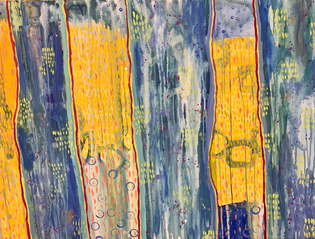 The base of this painting is a warm layer of orange which has been allowed to run horizontally. I have then added several layers of contrasting blue, running that vertically to create a “mirage of trees” in the background. The acacia tree in the foreground has been added, along with vegetation and patterned blue and yellow to create dimension.