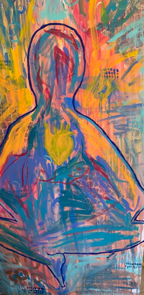 Sitting in the yoga pose call Sukhasana, the painting show a figure seated, resting in balance with her external environment, enlightenment.