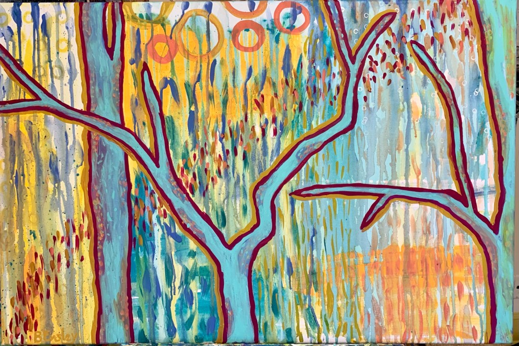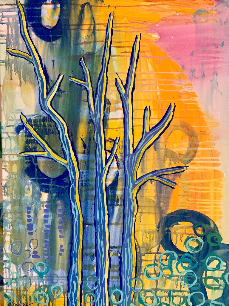This mirage-like painting was created by first painting a base coat, then overlaying that with paint I watered down and allowed to run across the surface of the canvas after turning it horizontally. I also intermittently painted large bold circles and smaller more evenly spaced ones to add depth. The bare branches also add to the overall wild feeling of this painting.
